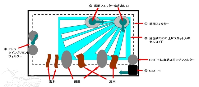 水流を岩に当てて弱める そんな強水流を景観を損なわずに弱める為に行った事として、水流をわざと 岩に当てて水流を弱めるという方法 です。 結果、かなりの強水流だった環境をここまで緩やかにする事が出来ました。 テトラのマイクロフィルター実験 ロングフィンタイプのアカヒレがフィルターの水流に巻き込まれて弱ってしまった、という話は聞いたことがありませんが、気になる人は水流を弱める工夫をしたほうがいいでしょう。 アカヒレに強い水流は禁物? まとめ 日本の熱帯魚ショップではまず底面フィルター(以下TF)についてですが ソイルの下に中が空洞になったプレートを敷き そこにパイプを通じてエアを送る事で それがポンプ変りとなり 水槽水はソイルの下のプレートから押し出され 逃げ場として差してあるプレートからのパイプを